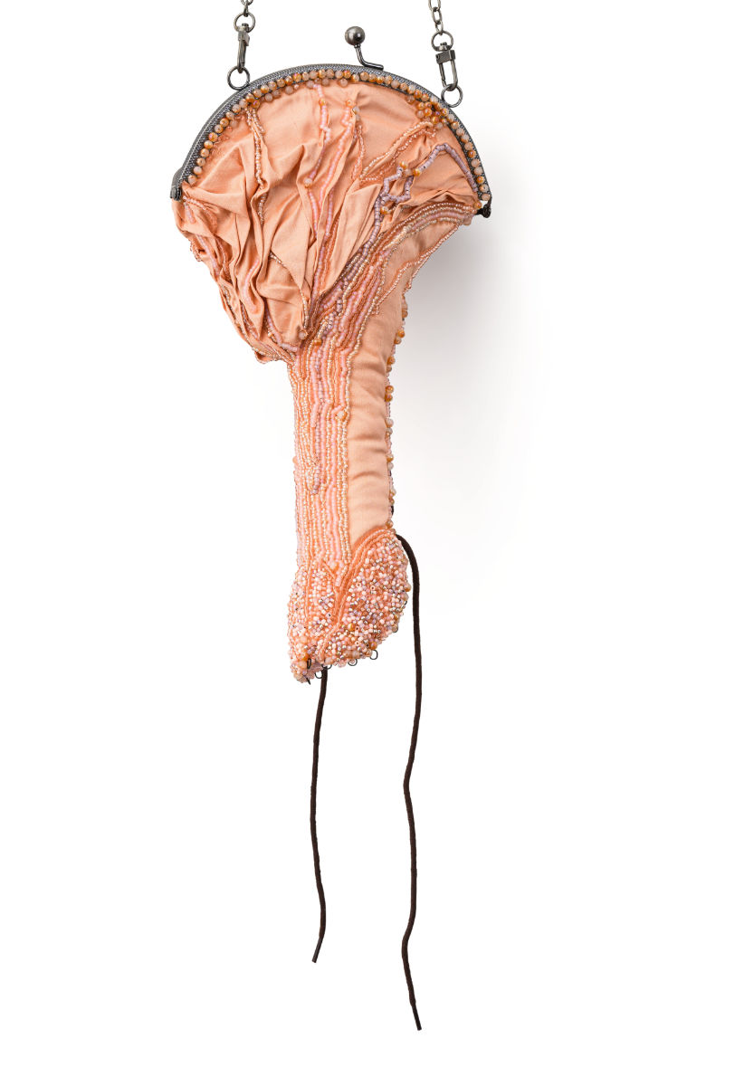 Pigbag (2023), 35x20x9cm. Beads, silk, wood, metal.